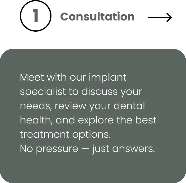 Meet with our implant specialist to discuss your needs, review your dental health, and explore the best treatment options.