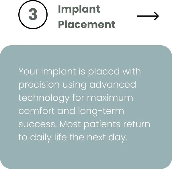 Your implant is placed with precision using advanced technology for maximum comfort and long-term success. Most patients return to daily life the next day.