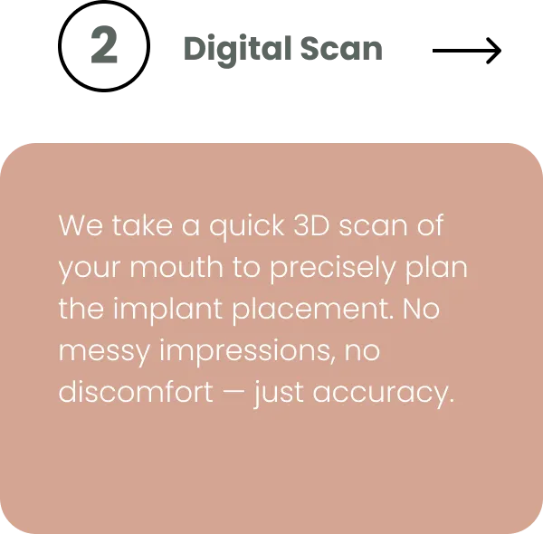 We take a quick 3D scan of your mouth to precisely plan the implant placement. No messy impressions, no discomfort — just accuracy.