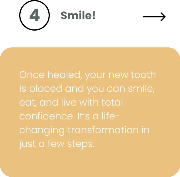 Once healed, your new tooth is placed and you can smile, eat, and live with total confidence. It’s a life-changing transformation in just a few steps.